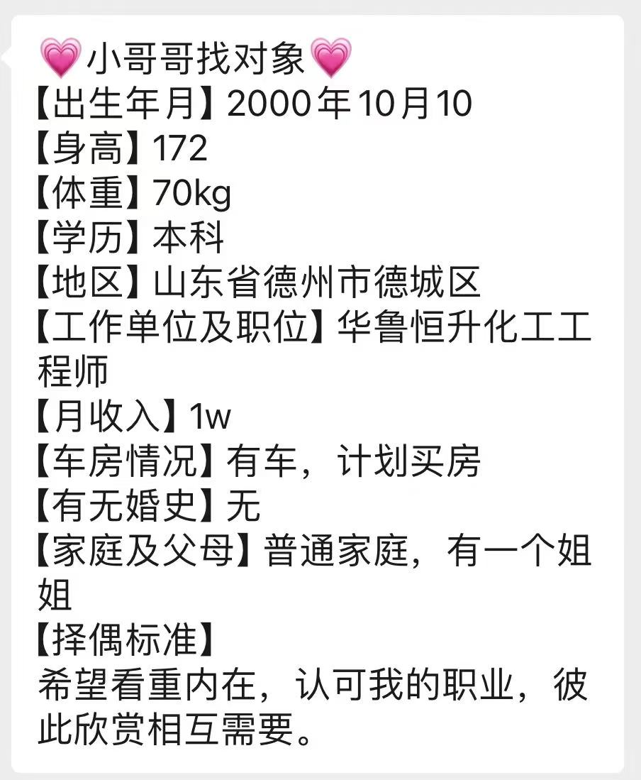 德州德城区的小哥哥找对象啦,职业工程师,收入1万➕,相中的私聊我介绍哦00-德城区-九儿脱单基地